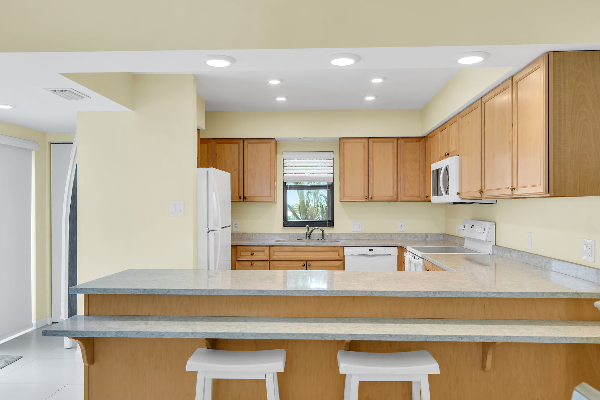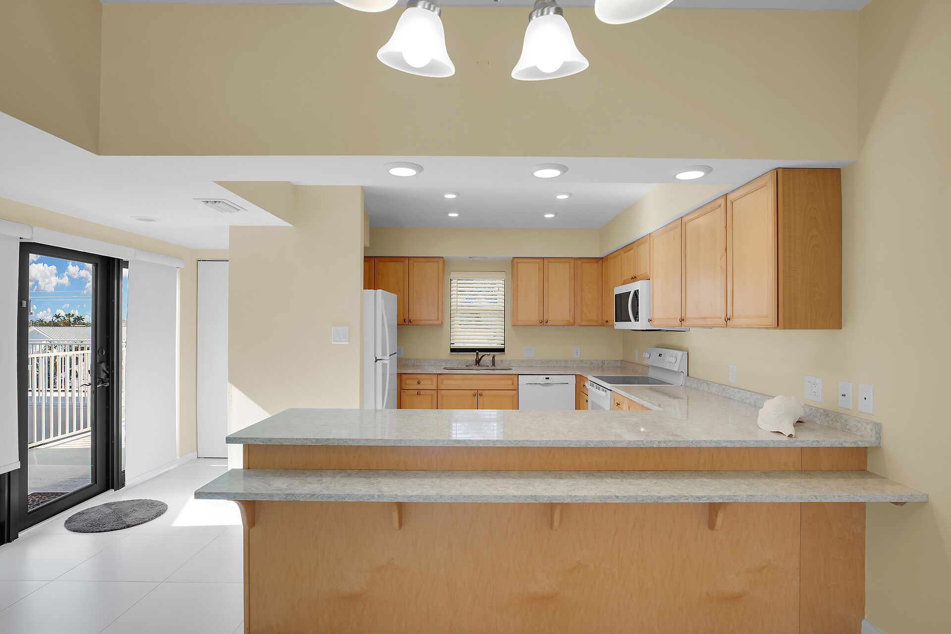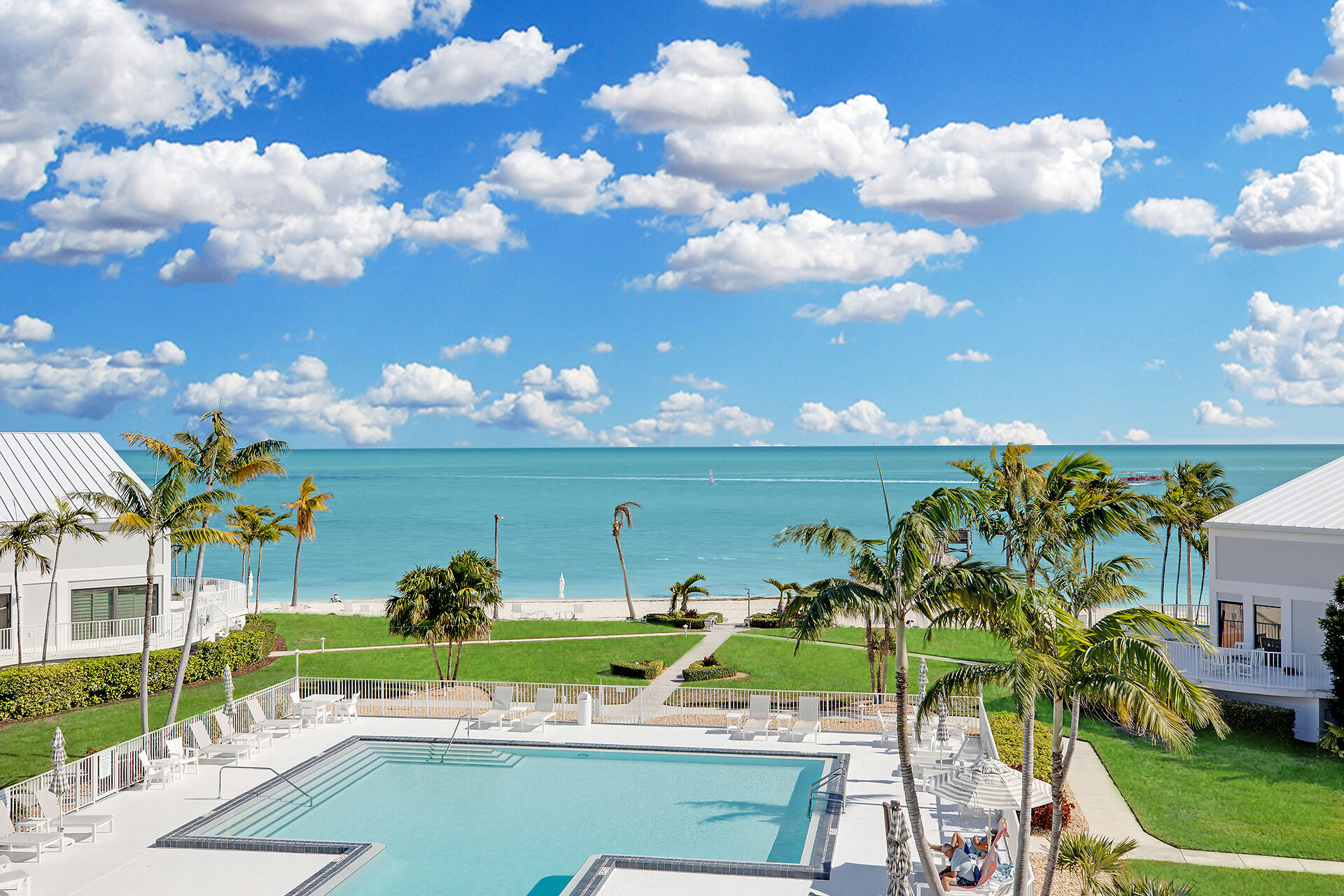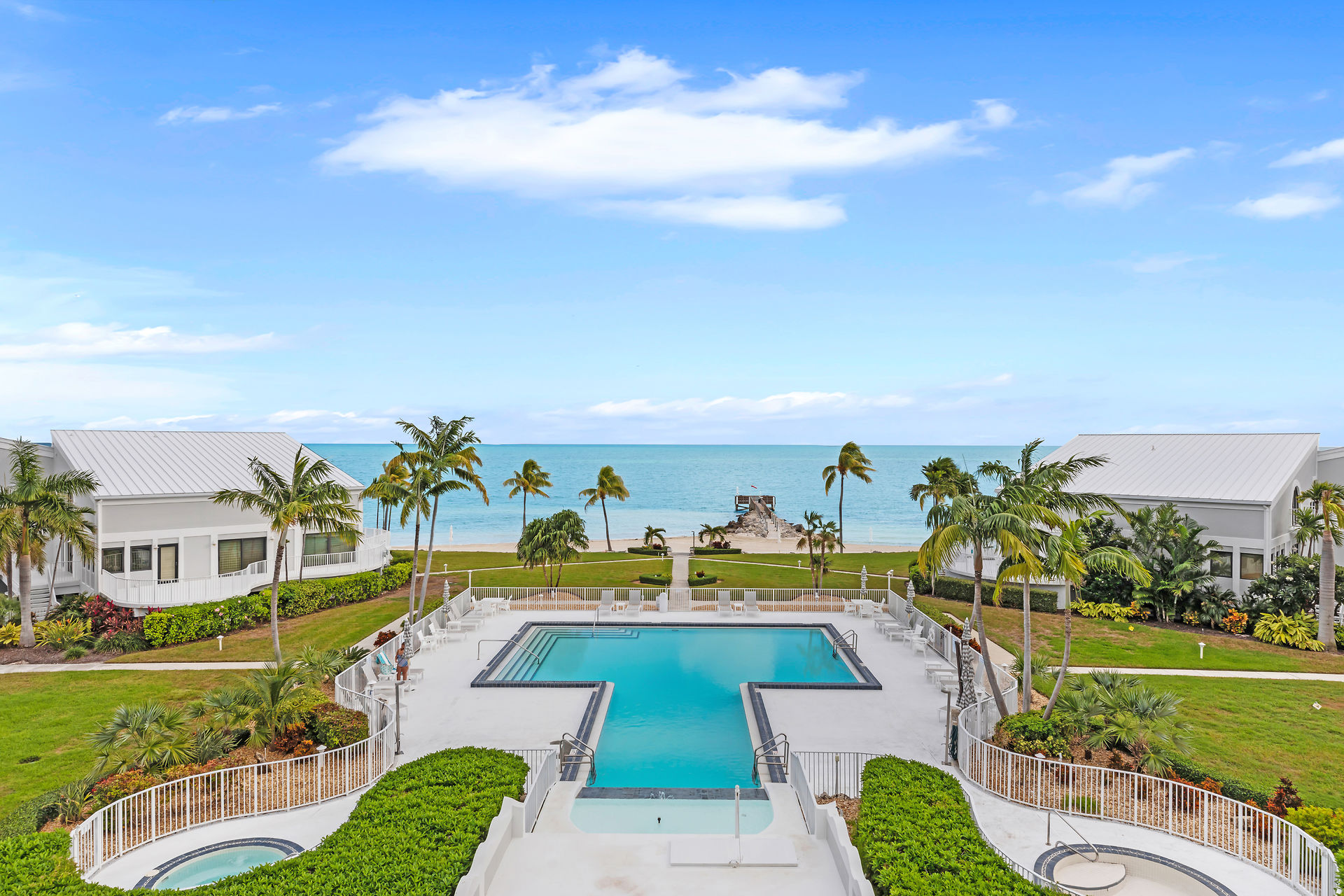 Stunning oceanfront condo with panoramic views of the white-sand beach and the resort-style T-shaped pool. Lush landscaped grounds, private fishing pier. Relax with a swim or lap session in the expansive pool. Inside, this spacious two-story top-floor residence features soaring cathedral ceilings and a large loft that can serve as a third sleeping area, office, or additional living space, with a large storage closet. Open-concept living area and the primary ensuite bedroom offer private balconies with breathtaking ocean views the beautifully manicured property. The well-designed kitchen allows meal prep while staying connected with guests. Live-in on site manager, elevator, covered parking, storage room.